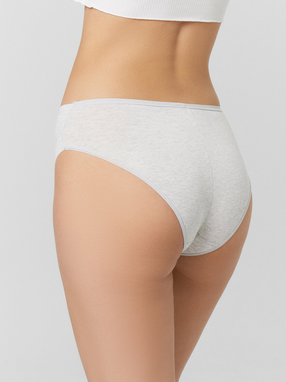 Задняя деталь со средним швом. Верхний срез обработан эл тесьмой 10 мм (жилка тканая Wt4-10, девсел 13460 W) с наложением на лицевую сторону полотна и с узким верхним застилом в край. Нижние срезы обработаны эл тесьмой 6 мм (жилка тканая Wt4-6, девсел 13460W). серый меланж