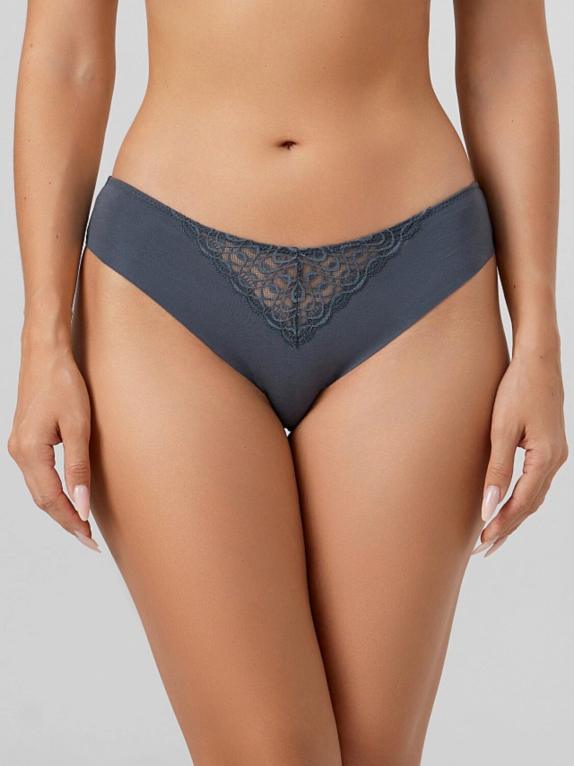 Передняя деталь с вставкой из эластичного кружева. Подкладка ластовицы из основного полотна, по переднему среду ластовица отлетная. По боковым сторонам насточена переднюю деталь. Задний шов ластовицы обработан на застиле. Талия обработана в два приёма, жилкой 6 мм (жилка WT4-6, девсель 13460W). Спинка цельнокроёная графит
