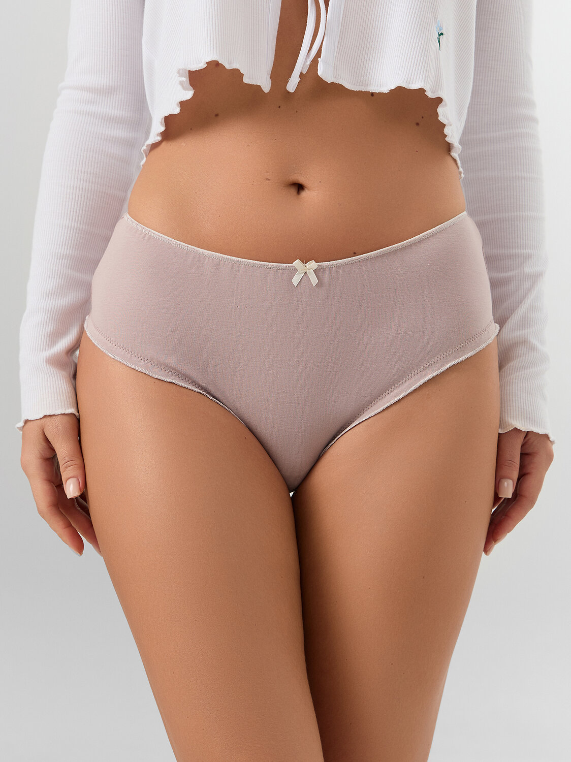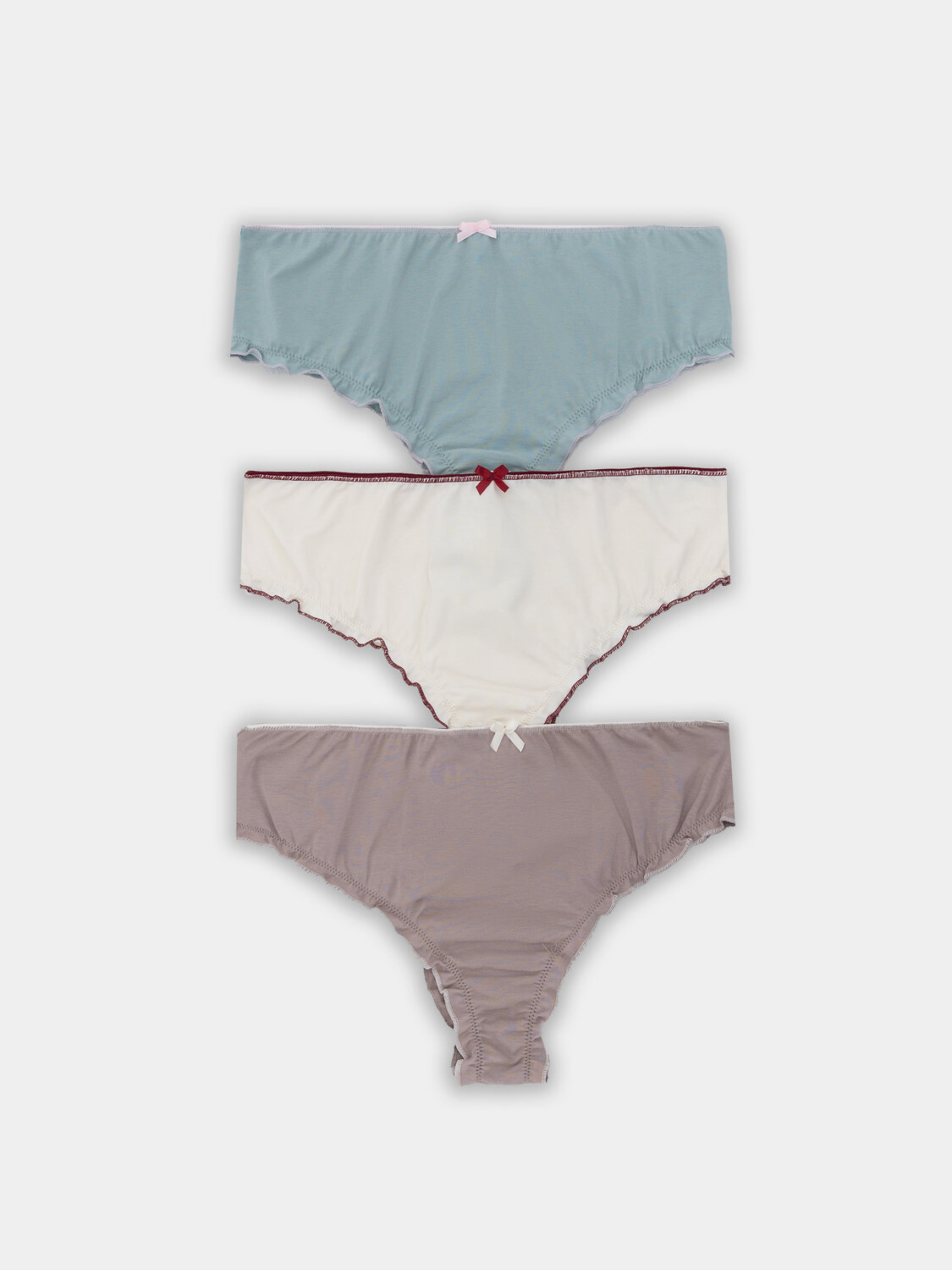 Набор из трех женских трусов-бразилиана — это элегантное и комфортное белье для повседневной носки. Модель со средней посадкой выполнена из легкого хлопкового трикотажа, который обладает высокой воздухопроницаемостью и обеспечивает комфорт в течение всего дня. Цельные передняя и задняя детали создают гладкий силуэт без лишних швов, что делает трусы практически незаметными под облегающей одеждой. Верхний срез украшен изящным бантиком, добавляющим образу женственности и игривого шарма.
