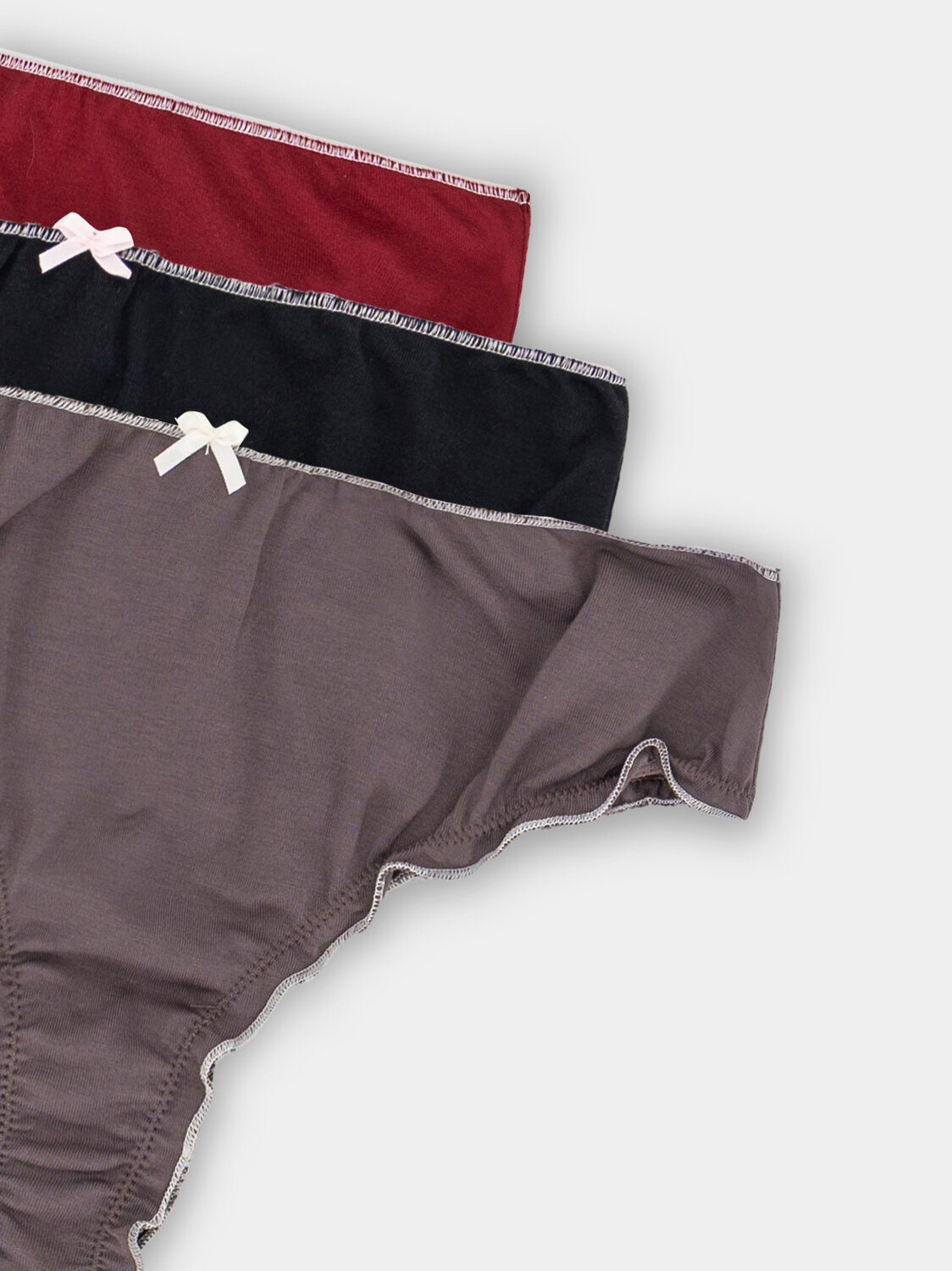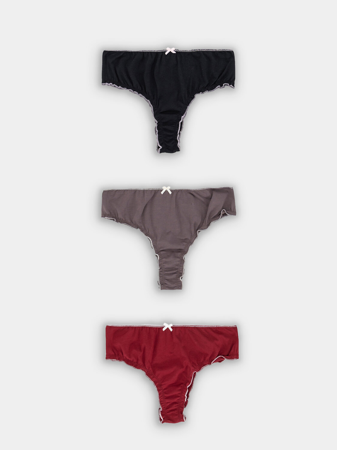 Набор из трех женских трусов-бразилиана — это элегантное и комфортное белье для повседневной носки. Модель со средней посадкой выполнена из легкого хлопкового трикотажа, который обладает высокой воздухопроницаемостью и обеспечивает комфорт в течение всего дня. Цельные передняя и задняя детали создают гладкий силуэт без лишних швов, что делает трусы практически незаметными под облегающей одеждой. Верхний срез украшен изящным бантиком, добавляющим образу женственности и игривого шарма.