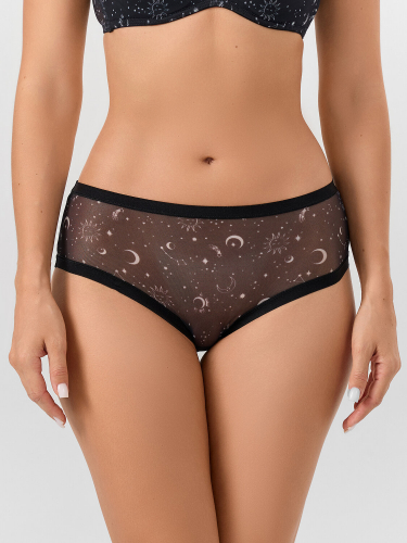 Трусы женские, силуэт - слипы, выполнены из трикотажного полотна сетки. Задняя и передняя деталь цельнокроеные. Подкладка ластовицы из кулирного полотна, отлетная по врхнему срезу. Верхние и нижние срезы обработаны закруткой, и собраны со сборкой на эл. тесьму 6мм (жилка Wt4-6, девсел 13460W) зигзагом.