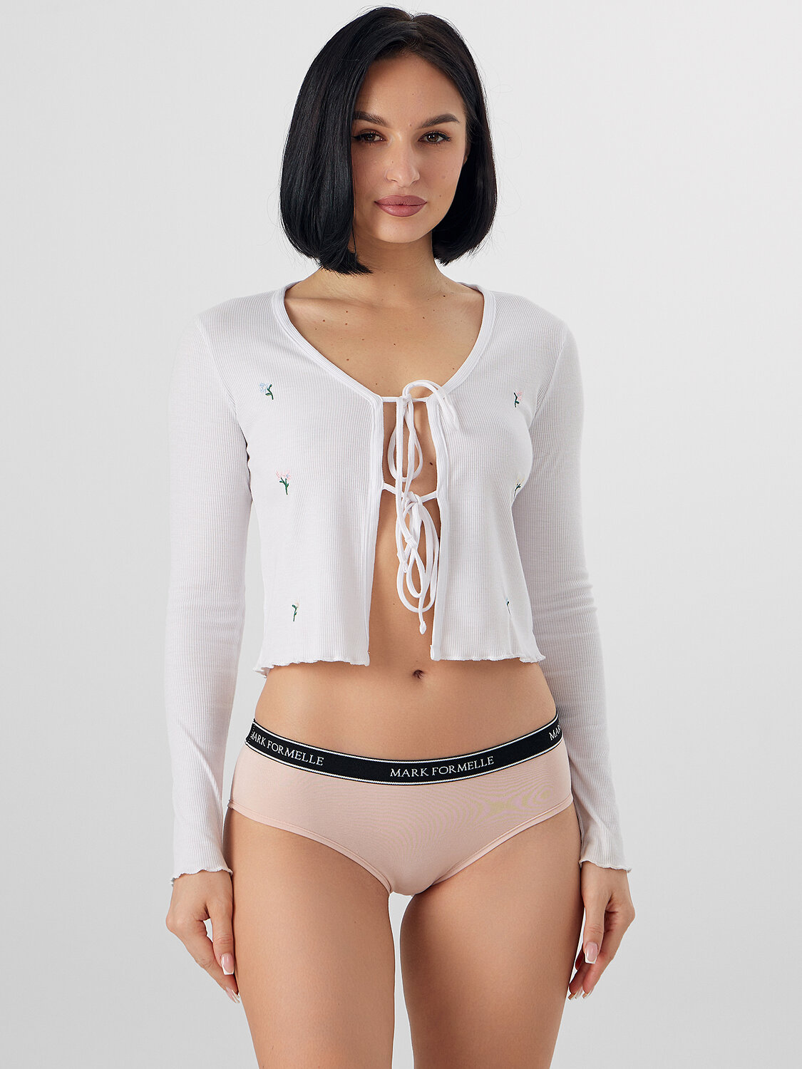 Трусы женские, силуэт - шорты, выполнены из триктажного кулирного полотна. Верхние срезы обработы эл тесьмой 25мм (жаккард JT19-25, Sedat арт. MF D-1 ) на плоскошовной машине. Задняя и передняя деталь цельнокроеные. Подкладка ластовица отлетная по переду из основного полотна.