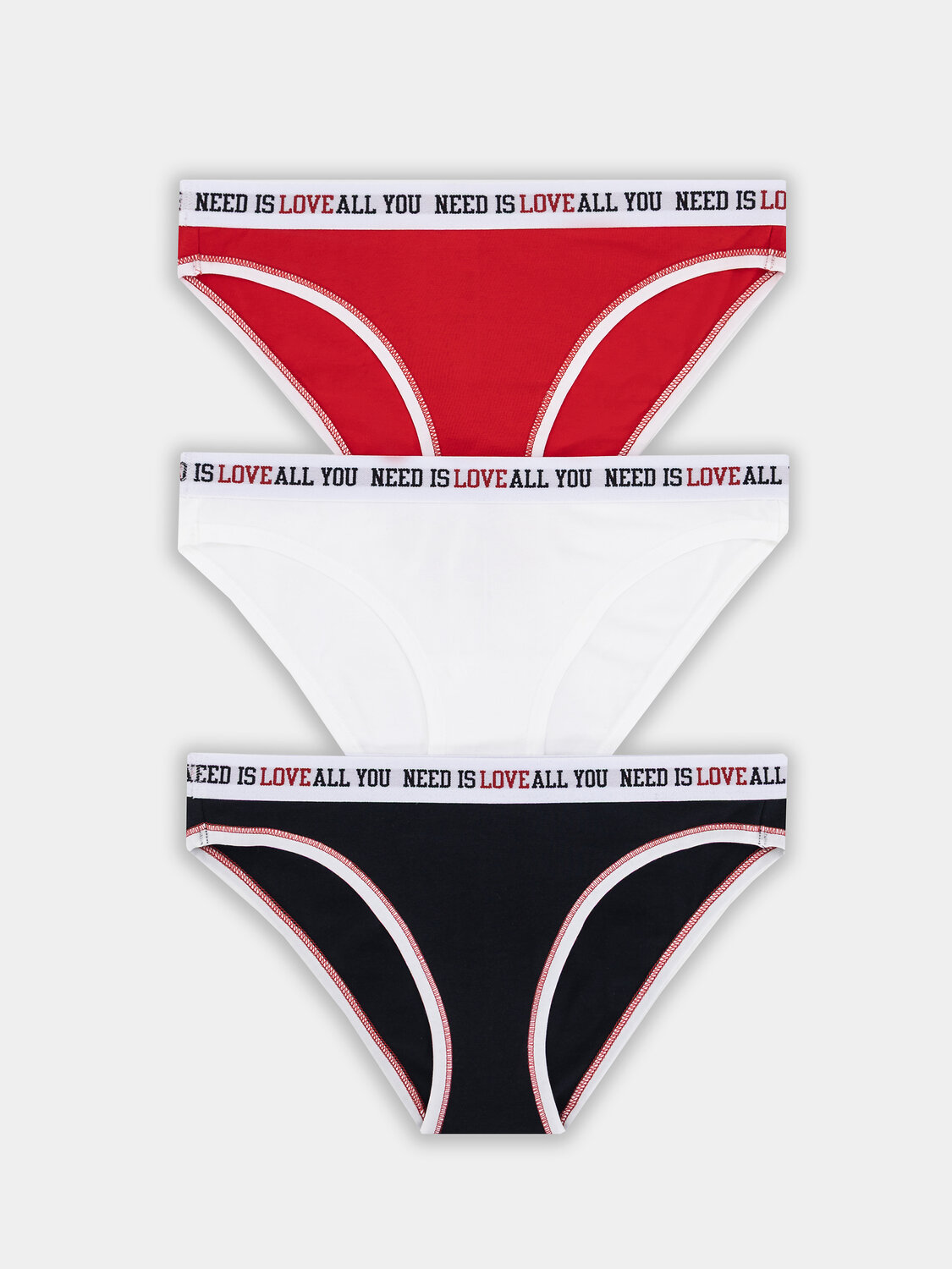 Модель со средней посадкой без лишних швов создает гладкую, почти невидимую линию под одеждой. Узкий бочок и аккуратно обработанные края исключают натирание. Верх украшен жаккардовой эластичной тесьмой с тёплой надписью «всё, что тебе нужно — это любовь». Усиленная ластовица из того же материала заботится о гигиене и долговечности.