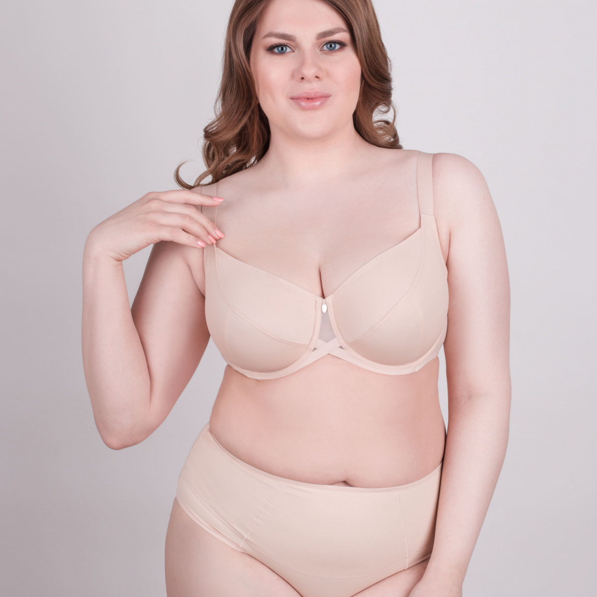 Классический бюстгальтер выполненный из не эластичного трикотажного и эластичного полотна, на каркасах. Мягкие чашки с тройным диагональным членением, на каркасе. Бретели - несъёмные. Такая конструкция, обеспечиваeт высокую степень поддержки за счет нижней детали чашки, которая выполняет корректирующую функцию; приподнимает, собирает с боков, центрирует грудь, создает округлую форму.
