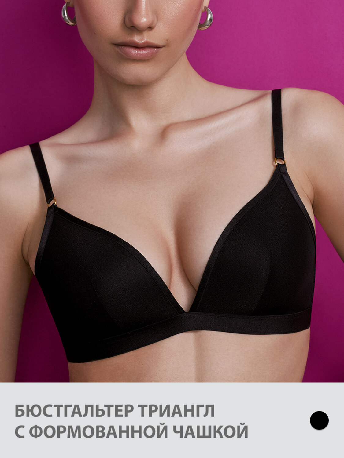 Бюстгальтер «триангл» из эластичной сетки с уплотненными формованными чашками без косточек. С акцентными лентами по краям. Эффектно подчеркивает декольте, превосходно облегает и обеспечивает комфортную поддержку благодаря регулируемым бретелям и удобной застежке на два крючка. Nero (Черный)