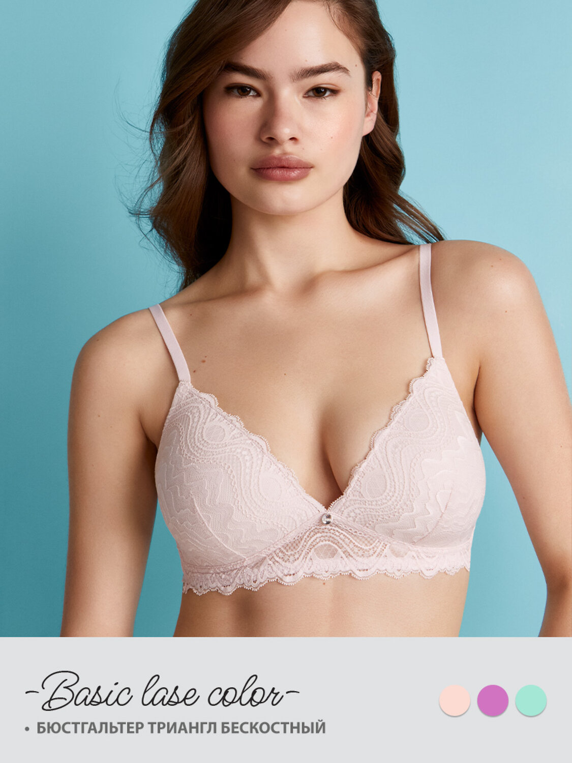 Кружевной бюстгальтер «триангл» на стане с уплотненными формованными чашками без косточек. Эффектно подчеркивает зону декольте, превосходно облегает и обеспечивает комфортную поддержку благодаря регулируемым бретелям, пластинам в боковых деталях стана и удобной застежке на два крючка. Cipria (Розовый)