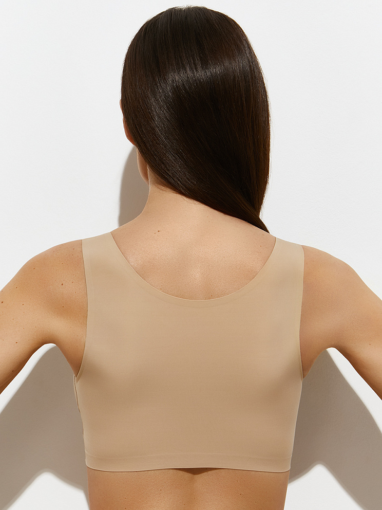 Изготовлен из гладкой микрофибры по прогрессивной технологии с использованием плоского клеевого шва и термоклеевой обработки края. Материал обладает высокой воздухопроницаемостью, приятно ощущается на теле, хорошо сохраняет форму и цвет. Передняя часть топа на подкладке дополнена съемными вкладышами. Топ превосходно облегает благодаря мягкой усиленной резинке, обеспечивает комфортную поддержку и создает эффект «второй кожи»,