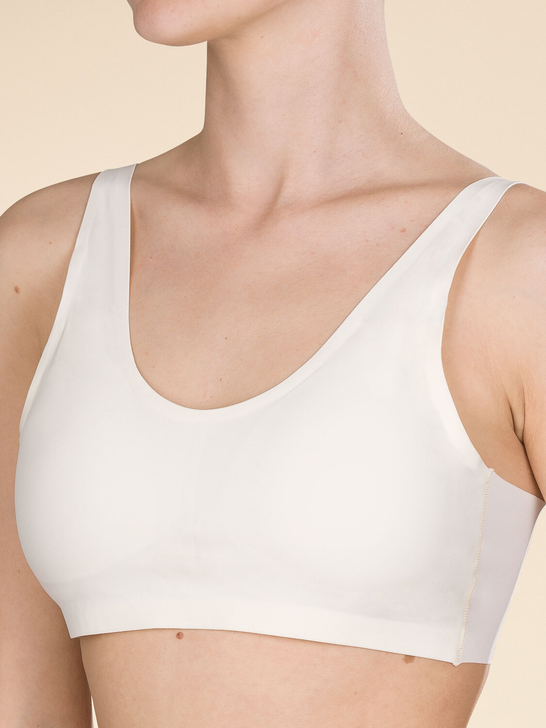 Женский бельевой топ. Изготовлен по бесшовной технологии с минимумом швов. Боковые плоские раздвижные швы, края горловины, проймы и низа изделия подогнуты и приклеены. Топ максимально невидим под одеждой, не натирает, комфортно сидит на теле. Съемные формованные чашки поддерживают грудь и создают красивый объем. Продуманное расположение регулируемых бретелей по спинке делают топ комфортным в носке, лямки не спадают с плеч. Этот топ станет идеальным функциональным нижнем бельем на каждый день.
