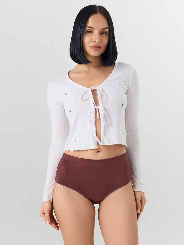 Передняя часть усилена эластичной сетчатой подкладкой для дополнительного комфорта, а задняя деталь оформлена аккуратным средним швом с силиконовой тесьмой для надежной фиксации. Мягкая обработка краев на талии и ножках обеспечивает удобную посадку без натирания.