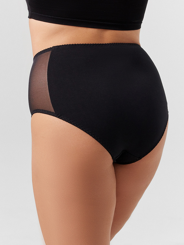 Набор черных женских трусов макси — это практичное и удобное решение для базового гардероба. Передняя и задняя части трусов выполнены из мягкого хлопка, а боковые вставки — из эластичной сетки. Такая конструкция обеспечивает плотное, но мягкое облегание, подчеркивая линию бедер. Ластовица с хлопковой подкладкой гарантирует гигиеничность и дополнительный комфорт. Пояс и окантовка обработаны эластичной тесьмой, которая надежно держит форму, не врезаясь и не сползая.