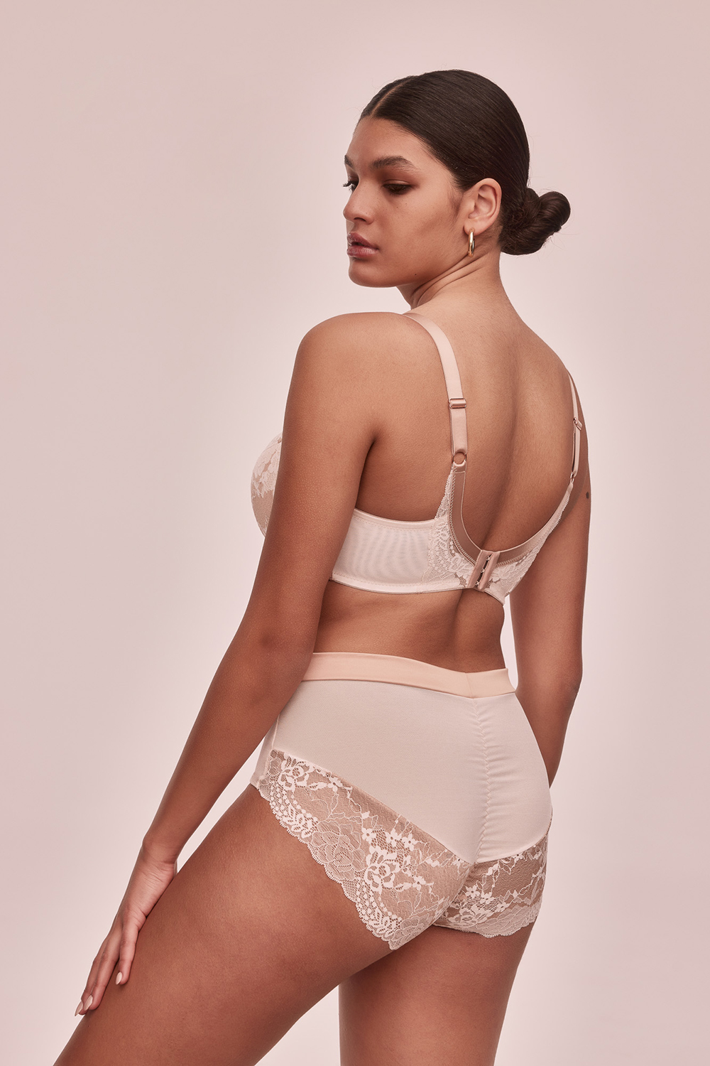 Трусики-слип с завышенной посадкой и широким бочком. Выполнены из гладкого эластичного материала, эластичной сетки и нежного кружева. Ластовица хлопковая.