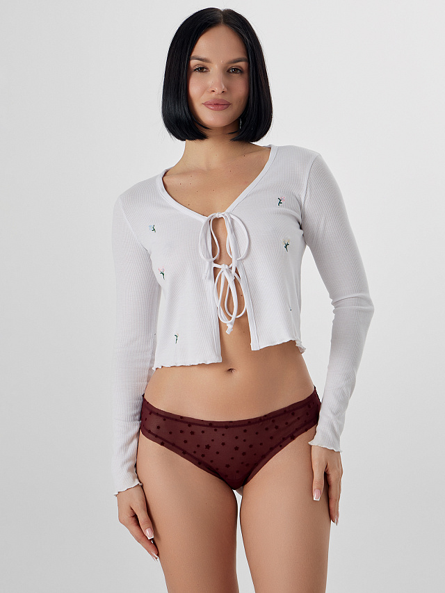 Трусы женские, средняя линия талии, силуэт - бразилиано. Передняя и задние детали выполнены из сетки. Подкладка ластовицы из хлопка, верхний срез подкладки ластовицы отлетной. По верхнему срезу трусов и по ножкам рюша из сборки, под низом жилка.