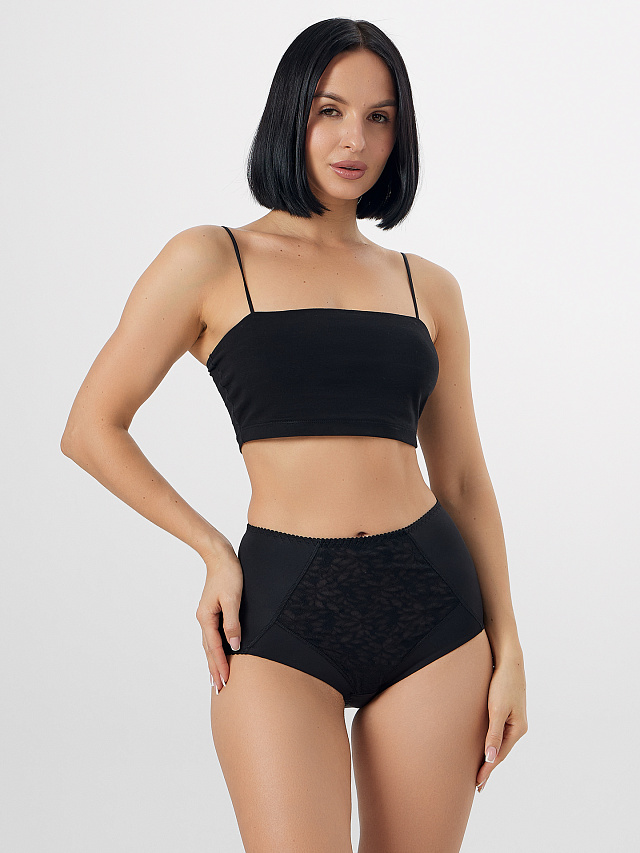 Трусы женские, силуэт макси, выполнены из трикотажного полотна микрофибра. Передняя деталь в центре декорирована кружевным полотном, на подкладке из монокапрона. Нижние детали переда двойные. Внутри по ножкам стоит эл тесьма 6мм (жилка Wt4-6, девсел 13460W). Подкладка ластовицы выполнена из кулирного полотна. Швы передних деталей, ластовицы обработаны на плоскошовной машине с верхним застилом. Срезы по ножкам зад. дет., ластовице обработаны эл. тесьмой с зубом 10мм (жесткая c/з WTE1-10 devsel 558W ) зигзагообразной строчкой. По верхнему срезу эл. тесьма 12мм (жесткая с/з WTE1-12, devsel 558W).