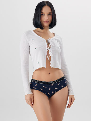 Трусы женские, силуэт - шорты, выполнены из триктажного кулирного полотна. Верхние срезы обработы эл тесьмой 25мм (жаккард JT19-25, Sedat арт. MF D-1 ) на плоскошовной машине. Задняя и передняя деталь цельнокроеные. Подкладка ластовица отлетная по переду из основного полотна.