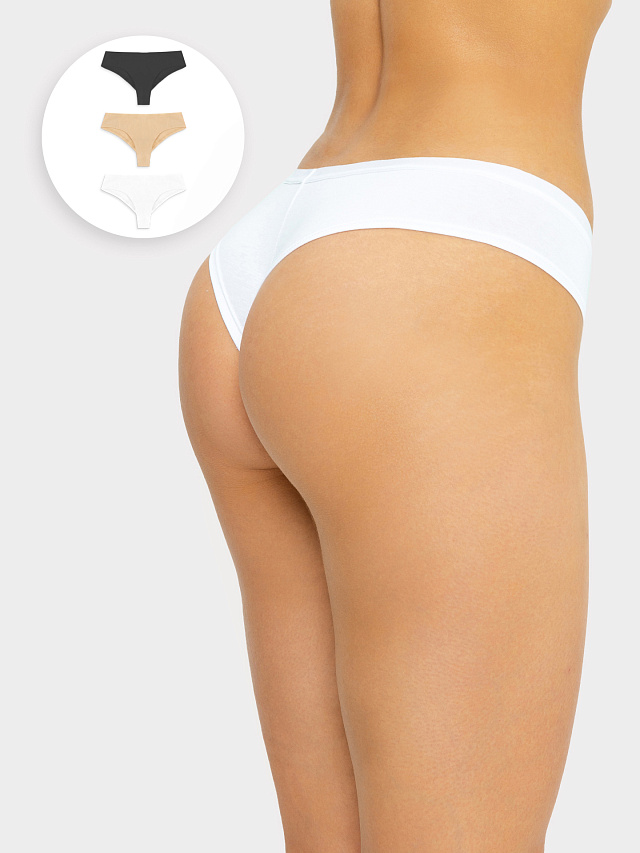 Мультипак (3 штуки) хлопковых трусиков-бразилиана из натурального, гипоаллергенного, дышащего полотна. Линия талии занижена. На верхнем срезе – тонкая эластичная тесьма, по ножкам – шов вподгибку. Почти не заметны под одеждой!