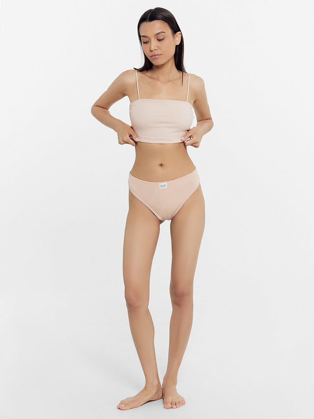 Трусы женские, средняя линия талии, силуэт - бразилиано. Передняя и задняя детали выполнены из рибаны. Верхний срез трусов обработан бейкой поперечной из рибаны, внутри жилка 6мм. Нижние срезы обработаны бейками поперечными из рибаны. Подкладка ластовицы из хлопка, верхний срез ластовицы притачан к детали из рибаны (с изнаночной стороны имитация мужского гульфика, с лицевой стороны декоративные строчки).