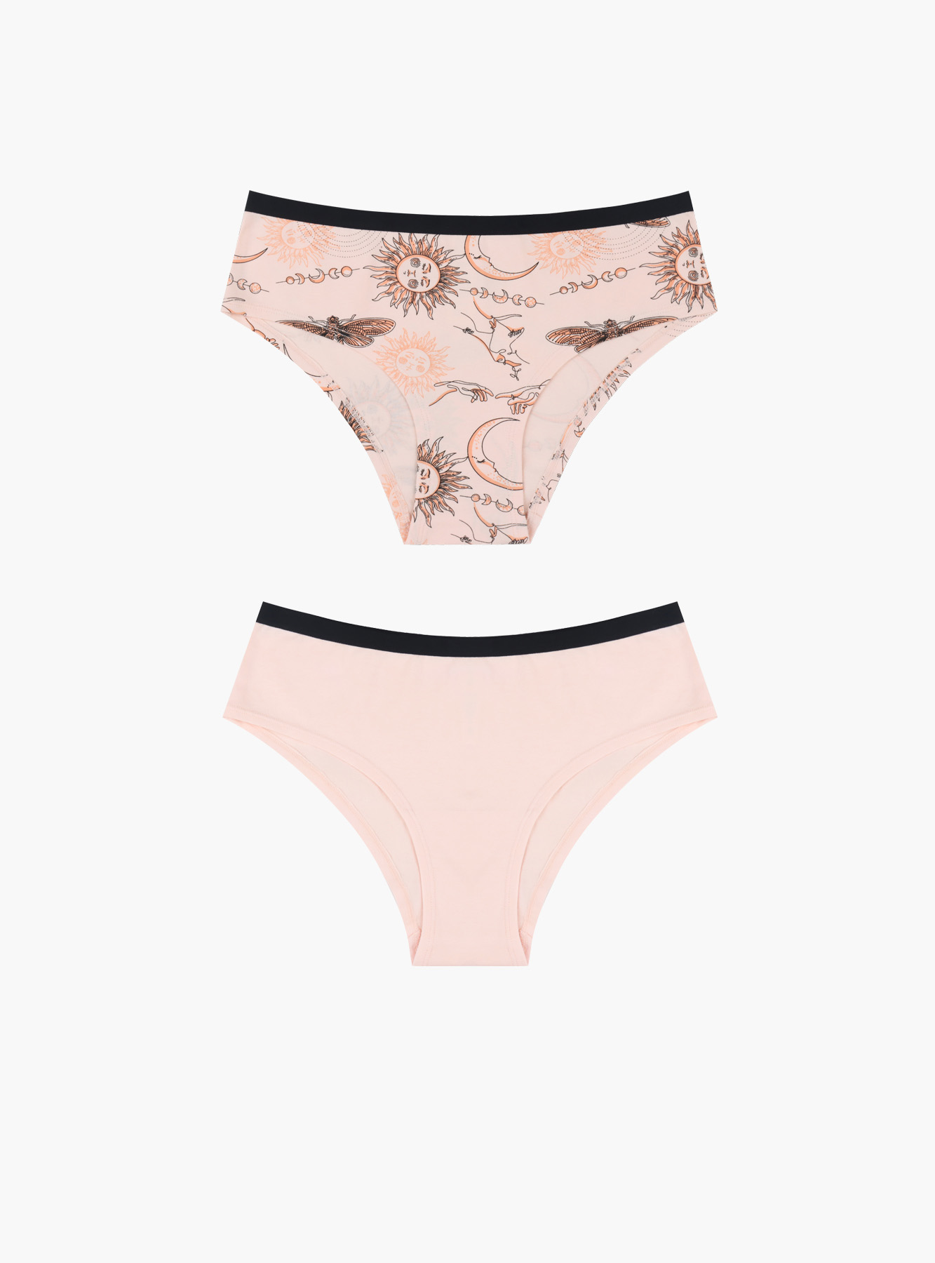 ✔ Модель 1 (принт): Нежный персиковый фон с арт-принтом в стиле мистической символики — солнце, луна, бабочки и звёзды создают атмосферу загадочности и женственности.