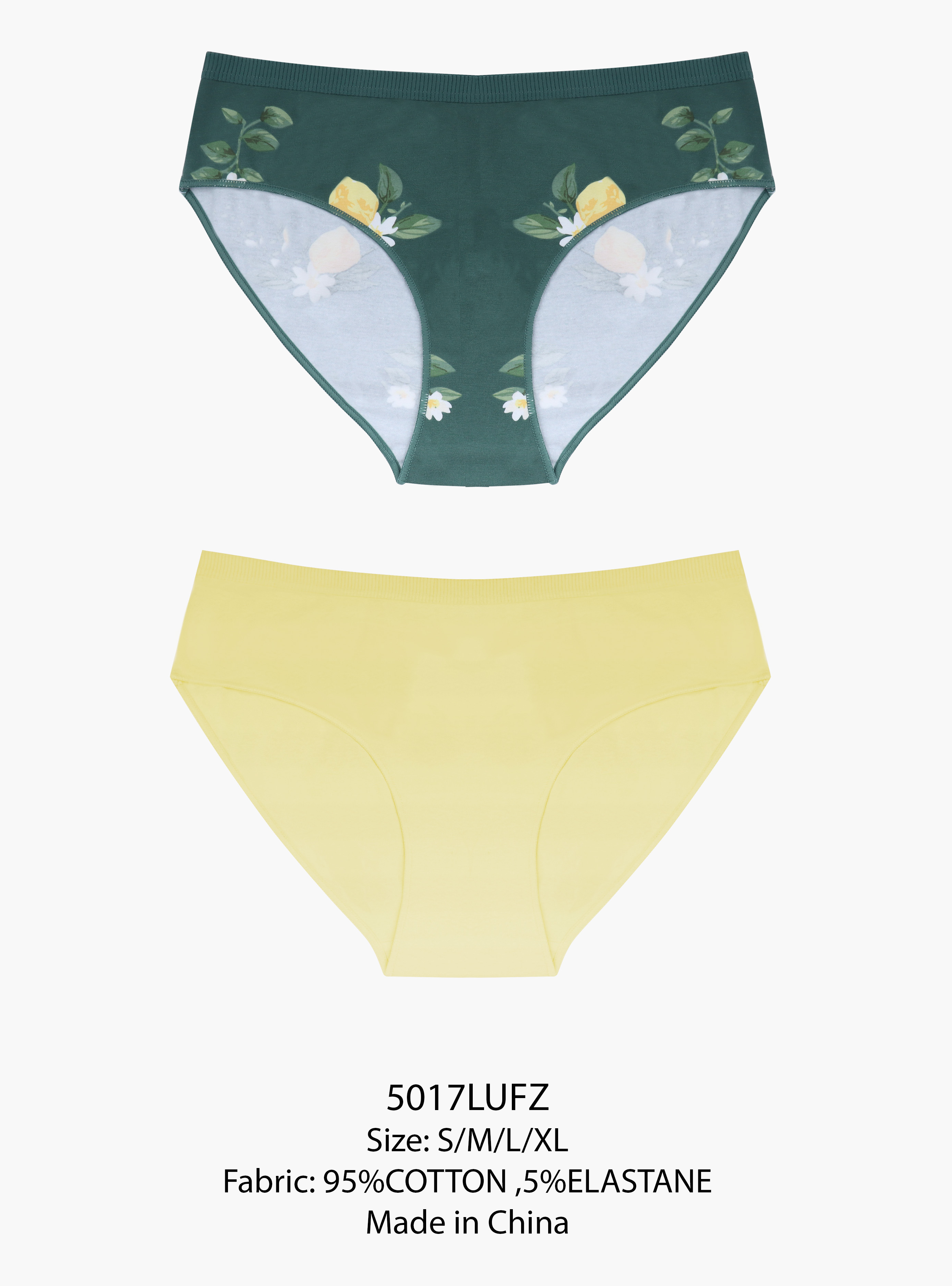 Набор трусов-слипов от бренда Indefini включает две модели: одну зелёного цвета с ярким лимонным принтом, вторую — однотонную жёлтую. Оба изделия выполнены из мягкого хлопка с добавлением эластана, что обеспечивает отличную посадку и комфорт на каждый день. Эластичная резинка мягко фиксирует трусы на талии, не сдавливая кожу.