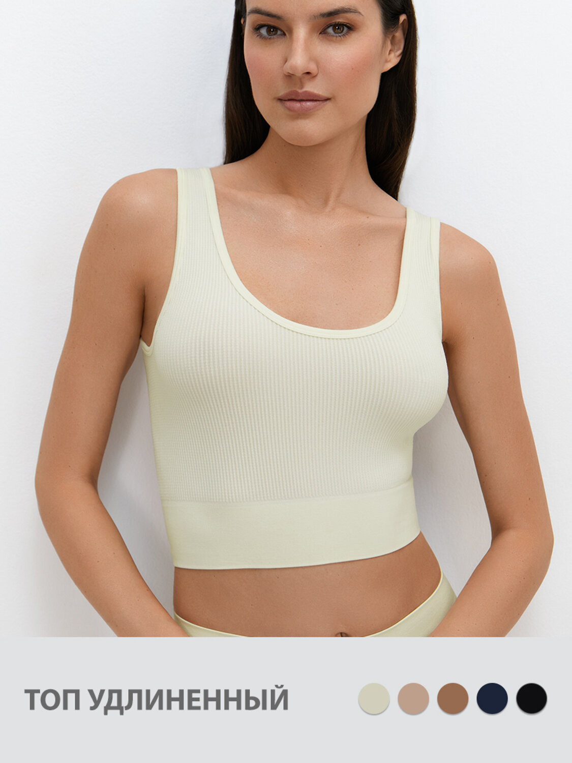 Бесшовный удлиненный топ из микрофибры с вафельным плетением на широких бретелях. В составе - нежный и легкий материал, который приятно ощущается на теле, позволяет коже дышать, впитывает влагу, хорошо сохраняет форму и цвет. Отсутствие застежек и косточек обеспечивает максимальный комфорт. Топ повторяет изгибы тела, превосходно облегает и подчеркивает естественную форму груди.