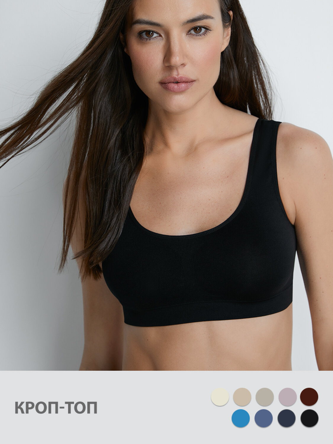 Женский топ из микрофибры на широких бретелях. В составе – нежная и легкая микрофибра, которая приятно ощущается на теле, позволяет коже дышать, впитывает влагу, хорошо сохраняет форму и цвет.