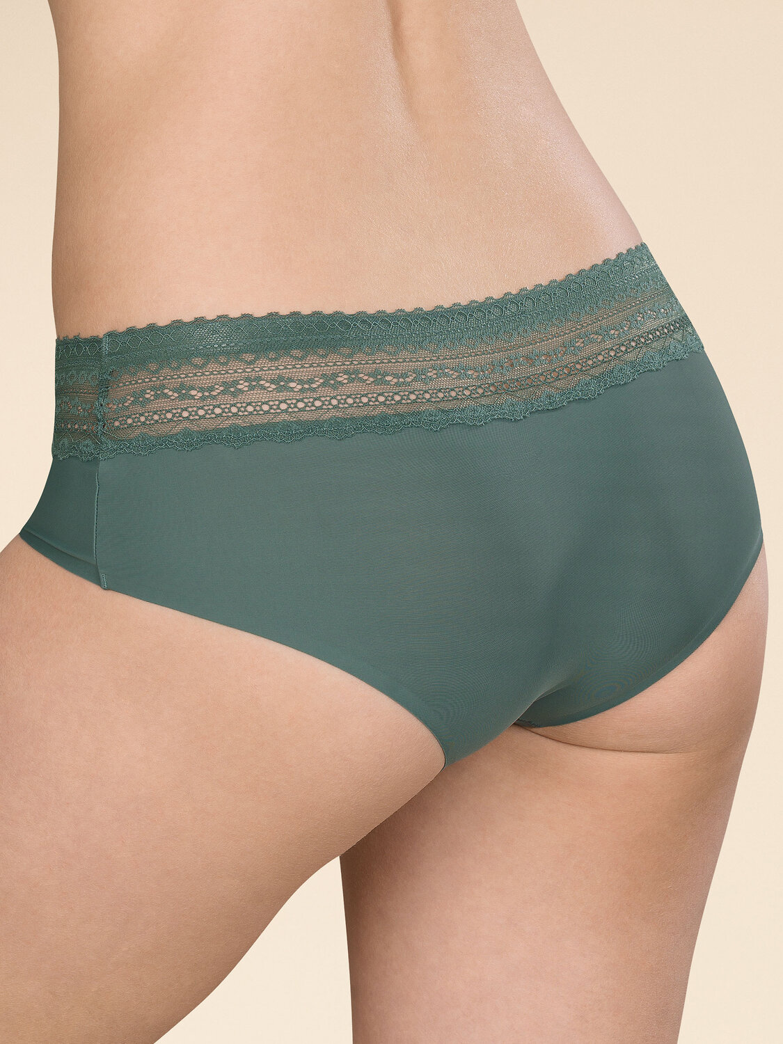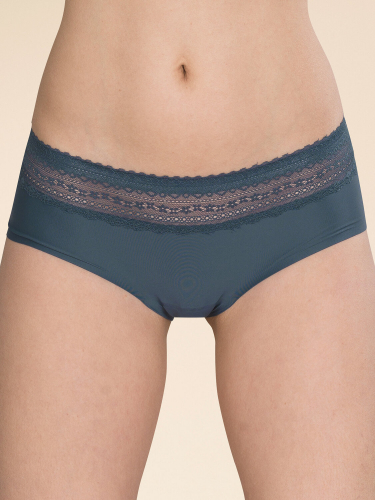 Женские трусы-шорты с низкой посадкой. Изготовлены по бесшовной технологии с минимум швов. Кромки по ноге и по талии подогнуты и приклеены, хлопковая приклеенная ластовица. Нежное геометричное кружево по линии талии высотой 5 см – не передавливает тело и не натирает кожу. Модель оценят те, кто ищет незаметное и невесомое белье на каждый день или особого случая.