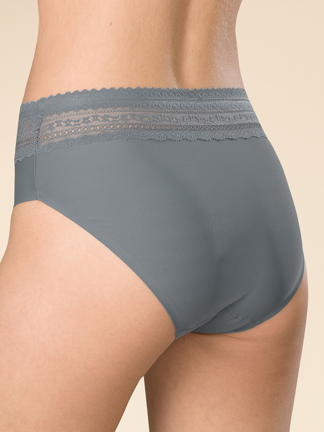 Женские трусы-слипы с высокой посадкой. Изготовлены по бесшовной технологии с минимум швов. Кромки по ноге и по талии подогнуты и приклеены, хлопковая приклеенная ластовица. Нежное геометричное кружево по линии талии высотой 5 см – не передавливает тело и не натирает кожу. Модель оценят те, кто ищет незаметное и невесомое белье на каждый день или особого случая. Модель представлена в универсальных цветах – черный, темно-синий, темно-серый, кремовый, молочный, охра, хаки и шоколадный. Выбирайте нужный размер по таблице размеров на фото. Цвет товара на экране вашего устройства может отличаться от цвета изделия вживую. Товар возврату и обмену не подлежит. Темно-серый