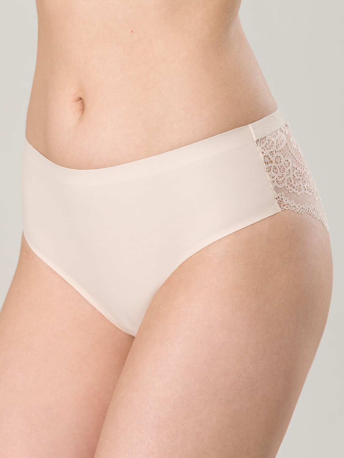 Женские трусы-слипы с высокой посадкой. Изготовлены по бесшовной технологии с минимум швов. Кромки по ноге и по талии подогнуты и приклеены, хлопковая приклеенная ластовица. Нежное цветочное кружево придает модели утонченный вид. Продуманный крой трусов создает изящный силуэт. Модель оценят те, кто ищет незаметное и невесомое белье на каждый день или особого случая. Кремовый