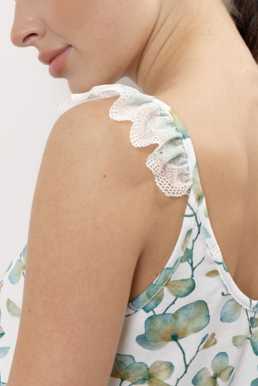 Пижама женская состоит из топа на тонких бретелях, декорированных кружевом в виде воздушных «крылышек». Вырез горловины круглый, слегка присборен. Шорты свободного прилегания на мягкой резинке. Комфортны и удобны в носке. По низу шорт нежное кружево.