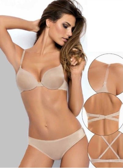 Бюстгальтер-трансформер с формованными градуированнмыми чашками на косточках из гладкой микрофибры, на тонких съемных бретелях. Невидимые швы позволяю носить модель под любую одежду. В комплекте два вида дополнительных бретелей. Серия "Fantastic".
