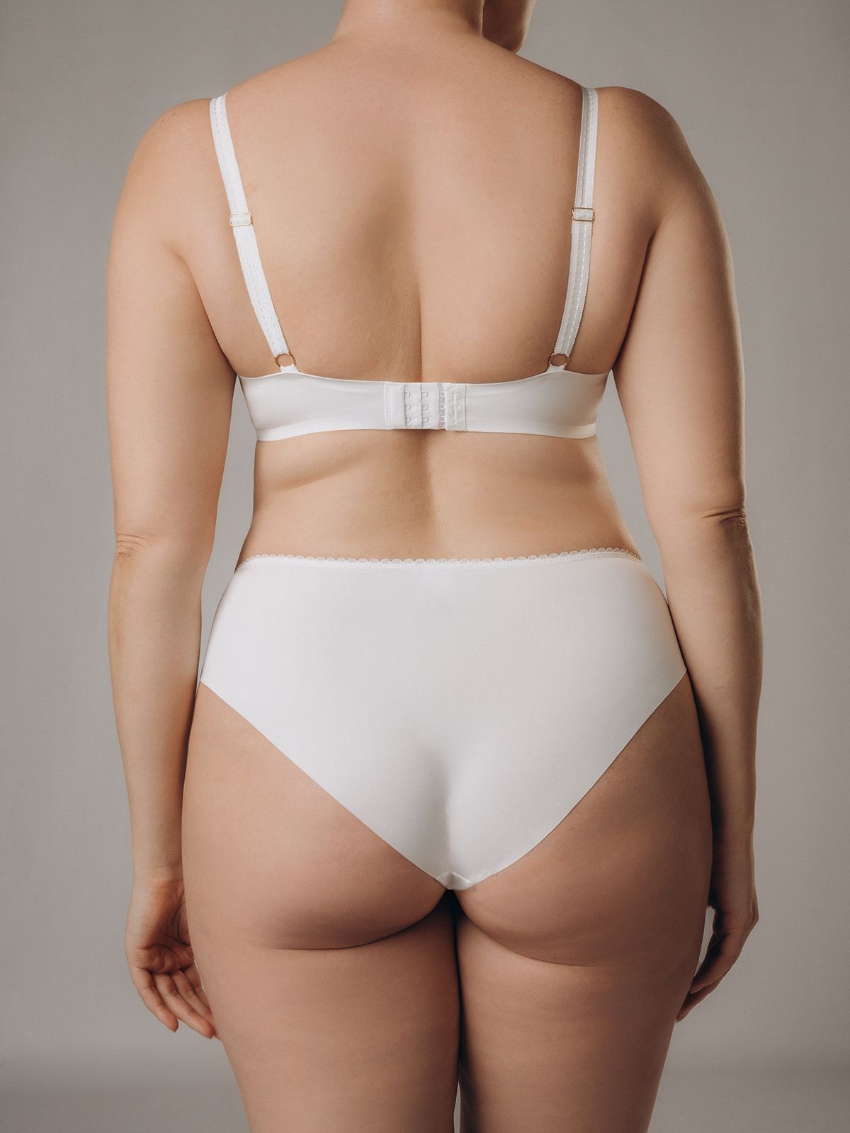 Женские трусы-слипы Indefini выполнены в белом цвете с кружевными вставками спереди, повторяющими цветочный мотив бюстгальтера. Мягкая эластичная ткань обеспечивает комфортную посадку и свободу движений, а классический крой делает модель универсальной для повседневной носки.