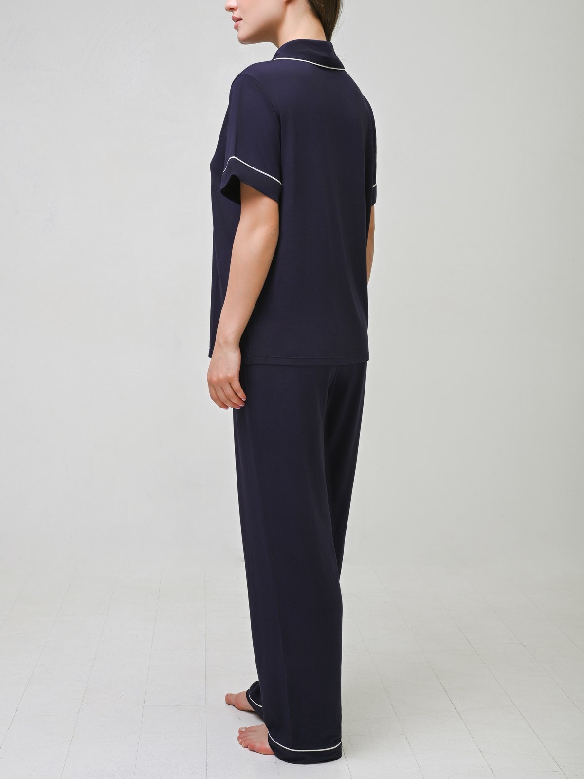 Пижама женская синяя 4263TBC бренда Indefini, изготовленная из модала, состоит из футболки и брюк.