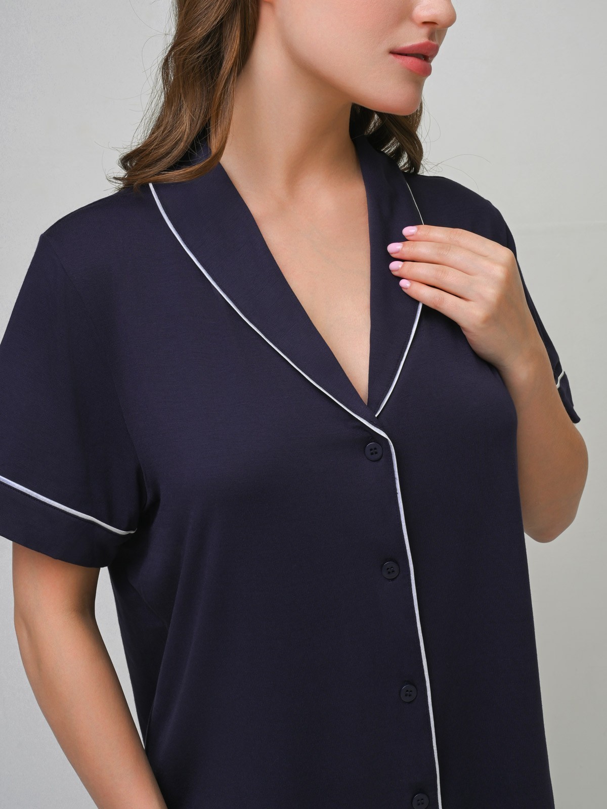 Футболка свободного кроя с отложным воротником и застегивающимися пуговицами спереди в цвет ткани.