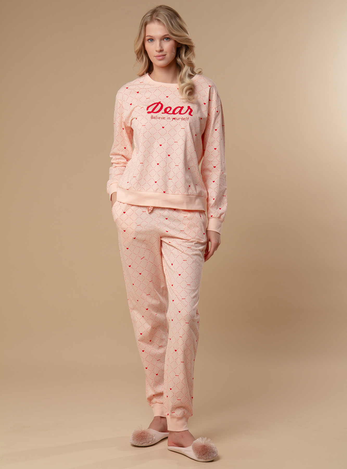 Женская пижама торговой марки Indefini, материнская серия. Женская пижама для девочек представляет собой комплект из кофты и брюк, созданные хлопка, обеспечивающем хорошую вентиляцию и воздухопроницаемость. Ткань мягкая и не растягивается после стирки.Кроме того, в костюме применен более популярный в этом году дизайн в форме ромба и принт в форме сердца, а комплект из серии "родитель-ребенок" создан для того, чтобы чувствовать себя полным любви. На пижаму нанесен яркий принт с мотивирующей надписью "Верь в себя" и рисунками сердечек. Эта женская пижама будет поддерживать уверенность и позитивное настроение у девушек и женщин, а также обеспечивать комфорт и уют во время сна. Верхний дизайн выполнен в более популярном в настоящее время дизайне с курсивными буквами.