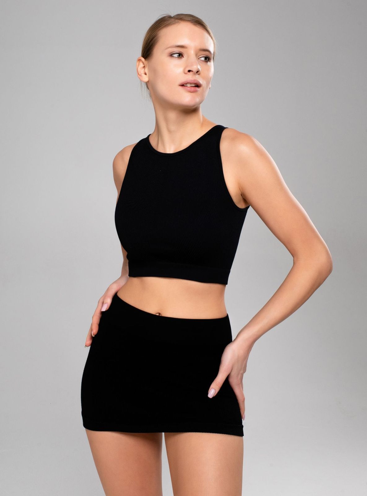 Юбка черного цвета, изготовлена из гладкой микрофибры без боковых швов, резинки в рубчик плотно фиксируют изделие на теле, не перетягивая и не сдавливая.