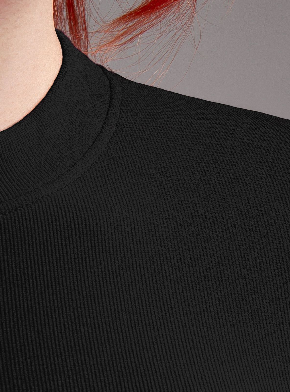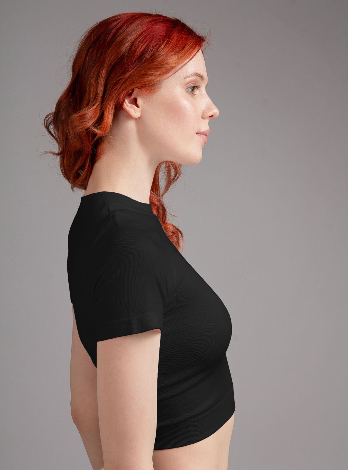 Женский топ от торговой марки Индефини.  Топ из полиамида, черного цвета, с короткими рукавами, с небольшим горлом, в рубчик, облегающий, укороченный.