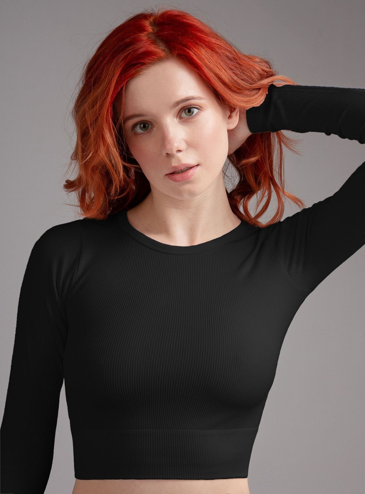 Лонгслив из полиамида, черного цвета, в рубчик, с длинными рукавами, облегающий, укороченный, на мягкой резинке."