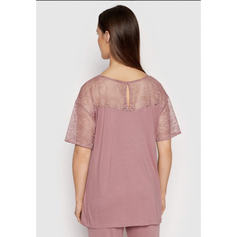 Блузка имеет удобный вырез-лодочка, декорированный красивым кружевом.