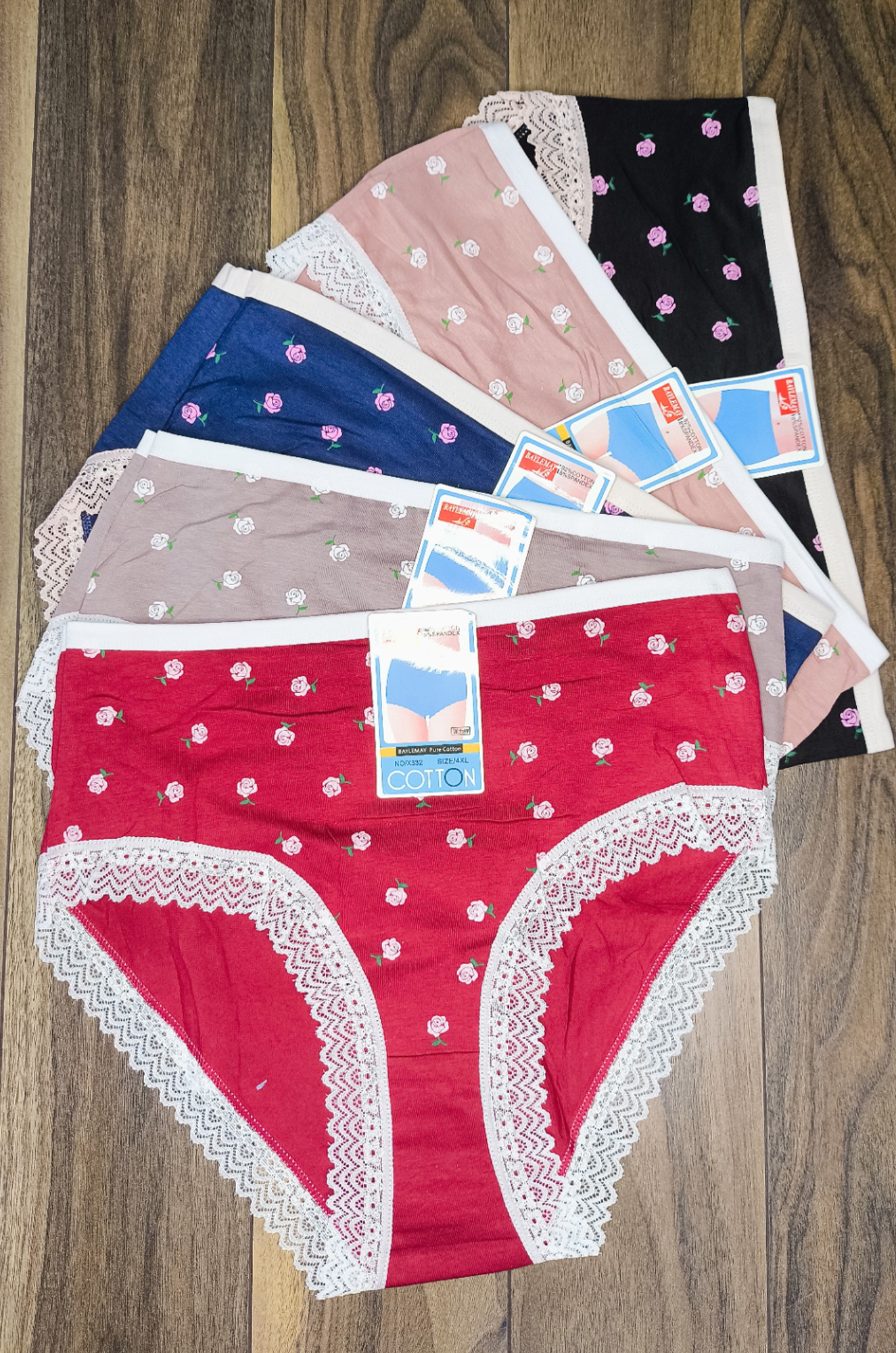 Женские хлопковые трусики с набивным рисунком и кружевом по краю. Комфортная средняя посадка, узкая резинка. Производство Китай.