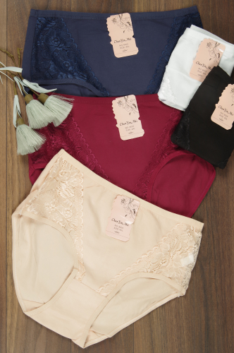Симпатичные классические трусики средней посадки из гладкого эластичного хлопка. Спереди набивной рисунок" и полоска кружева. Производство - Китай.