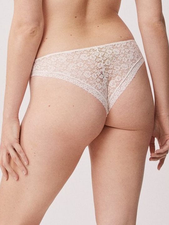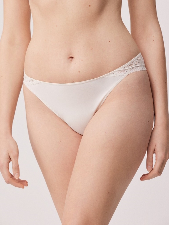 Экрю 36(S), 38(M), 40(L) Трусы бразильяно средней посадки. Сперели гладкие, сзади кружевные. 86% полиамид, 14% эластан