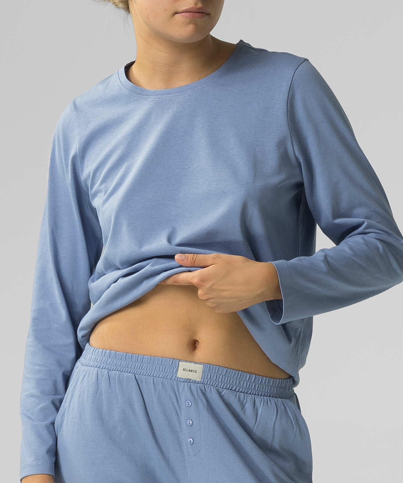 Женская пижама Atlantic синего цвета из коллекции домашней одежды. Коллекция Homewear польского бренда Atlantic - это женская одежда для домашнего отдыха и сна, которая представлена как готовыми пижамными комплектами. Женский пижамный комплект NLP-479 от польского бренда Atlantic превосходно подойдет абсолютно любой женщине. Фасон этой модели гарантирует идеальную посадку по фигуре и максимальный уровень комфорта. В состав пижамного комплекта для женщин входят лонгслив и штаны. Лонгслив имеет свободный крой, длинные рукава и круглый вырез. Штаны имеют два удобных кармана и завязываются на талии удобным широким шнурком и дополнена принтом в виде бантиков. Женская пижама футболка и шорты изготовлены из приятного на ощупь и легкого хлопка, который обеспечивает максимальный комфорт при ношении, а также предотвращает потоотделение тела и долговечен в использовании.