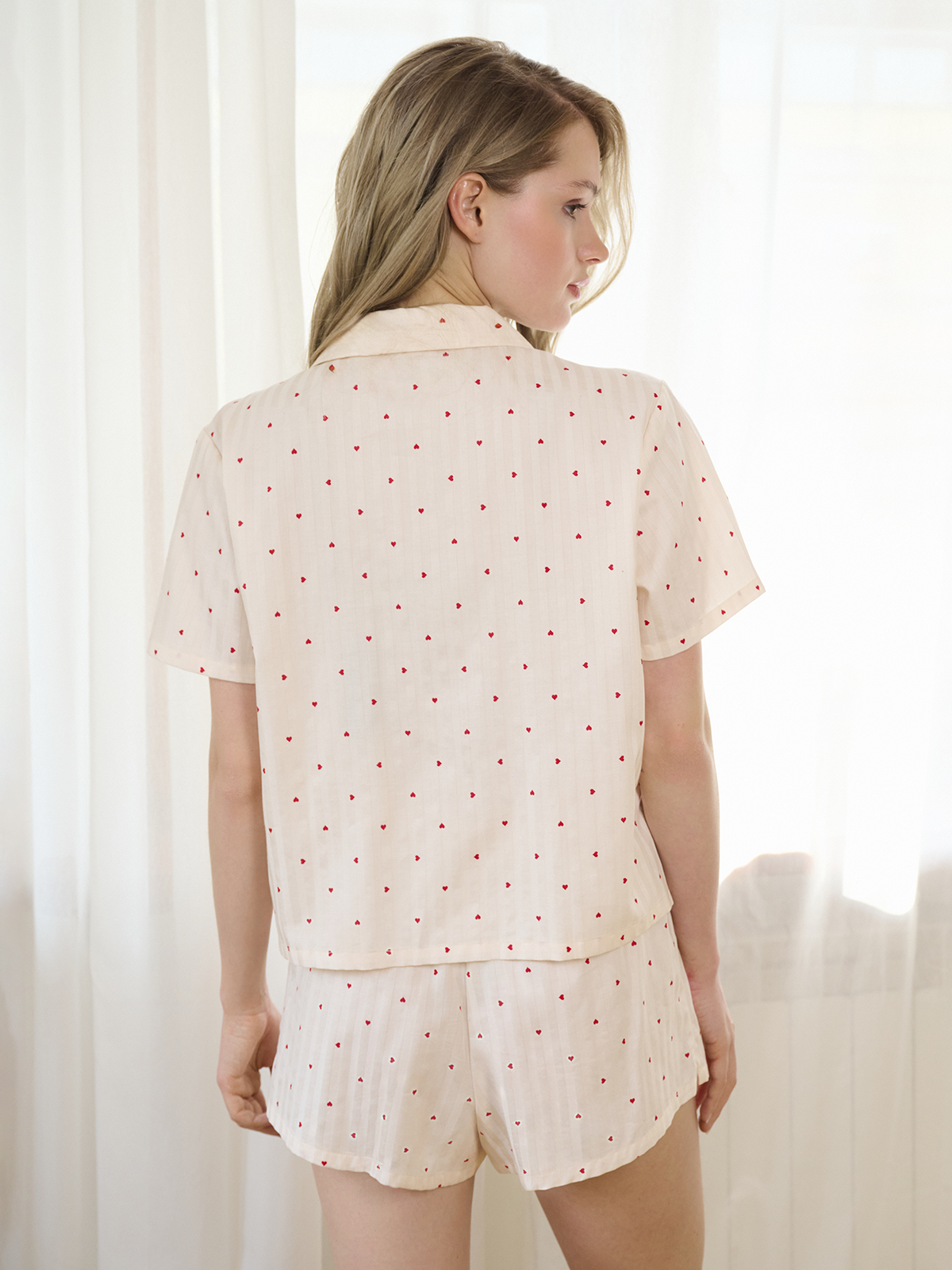Выполнена в светло-розовом цвете с мелким принтом из красных сердечек.