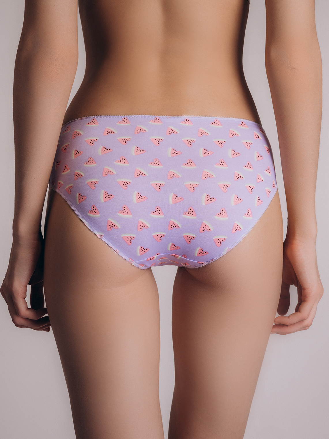 Сиреневые трусы-слипы от бренда Indefini с ярким принтом в виде дольек арбуза. Модель выполнена из мягкого хлопка с добавлением эластана, что обеспечивает отличную посадку и комфорт в течение дня. Эластичная окантовка мягко фиксирует изделие на талии, не сдавливая кожу, а небольшой бантик спереди добавляет игривый акцент.