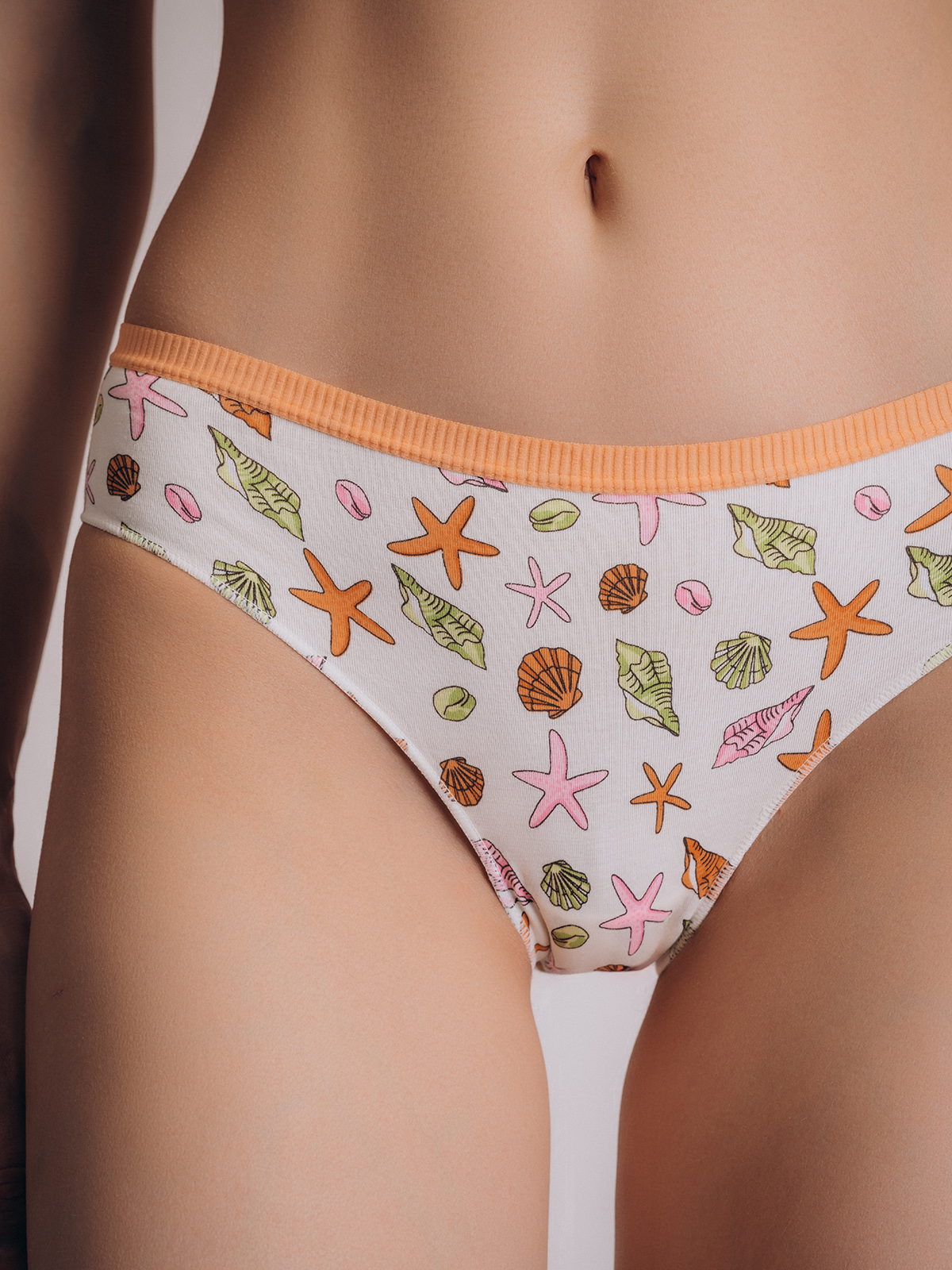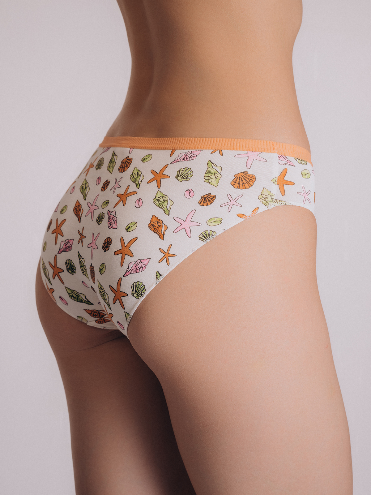 Выполнены в белом цвете с принтом, изображающим морские ракушки, звёздочки и кораллы в нежных летних тонах — оранжевом, розовом и мятном.