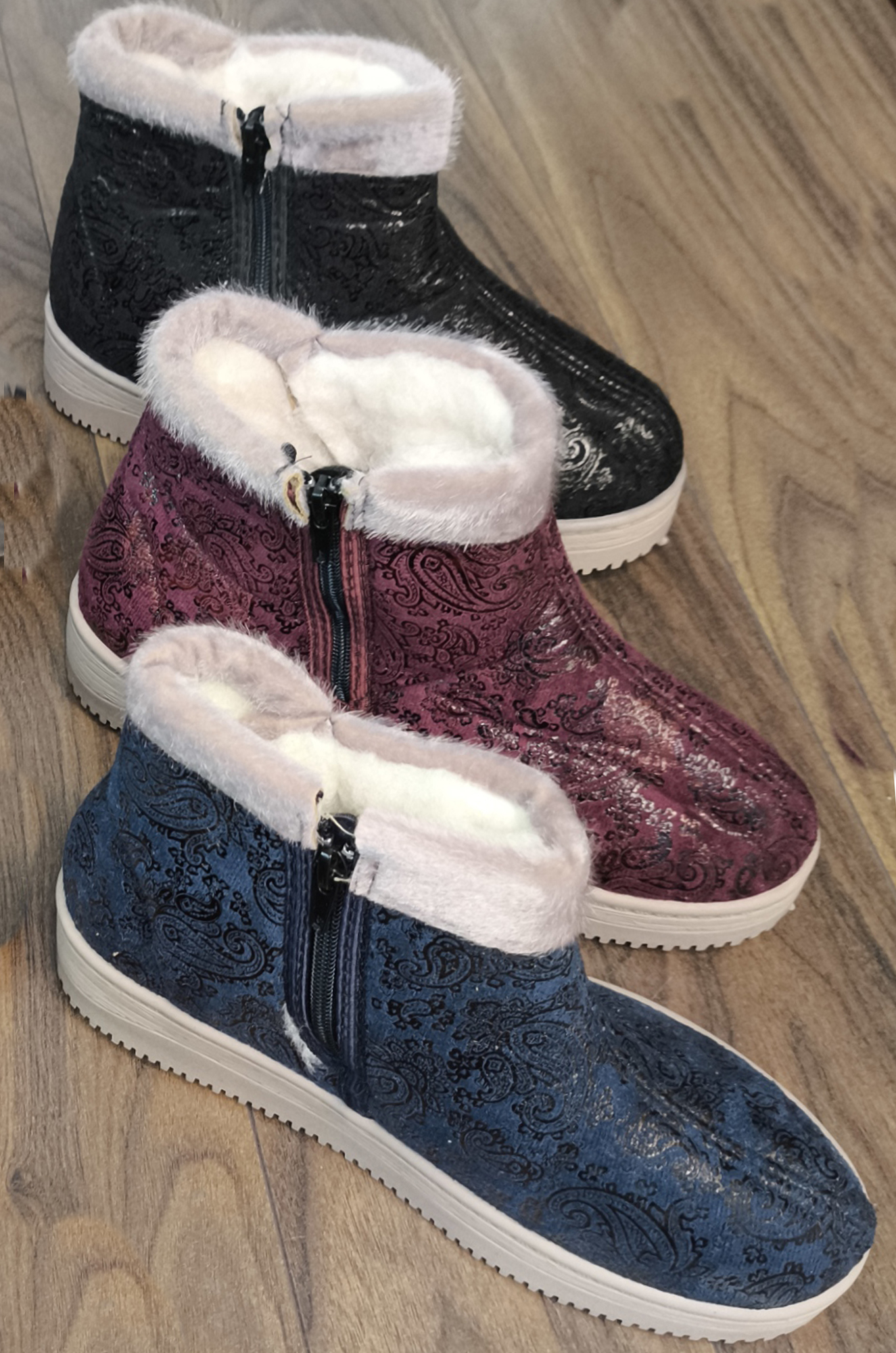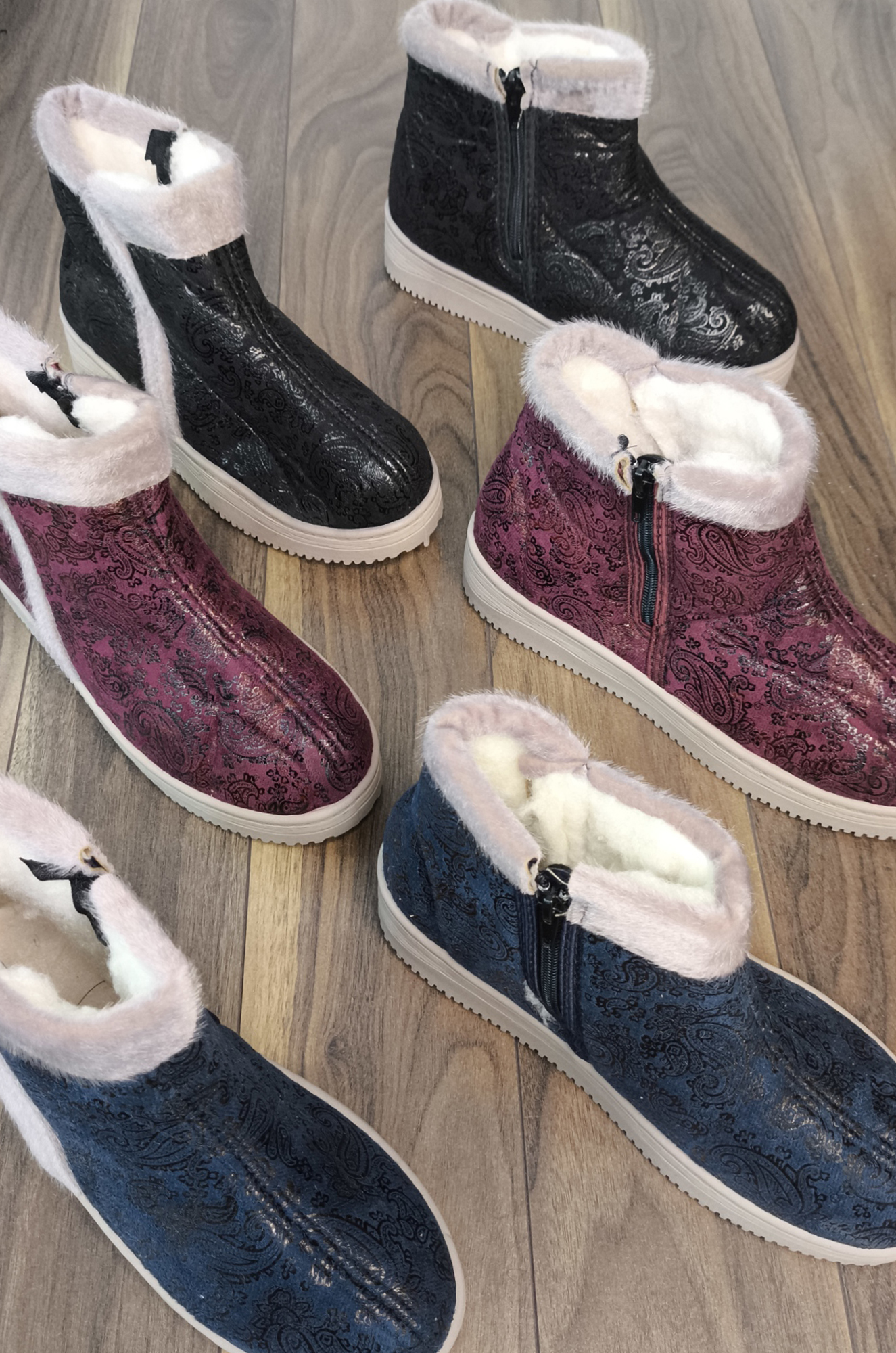 Женские ботинки под замшу с рисунком на ткани. Отделка по краю мехом под норку. Утеплитель - искусственный мех, застежка - молния. Высокая очень мягкая резиновая подошва. Производство Россия.