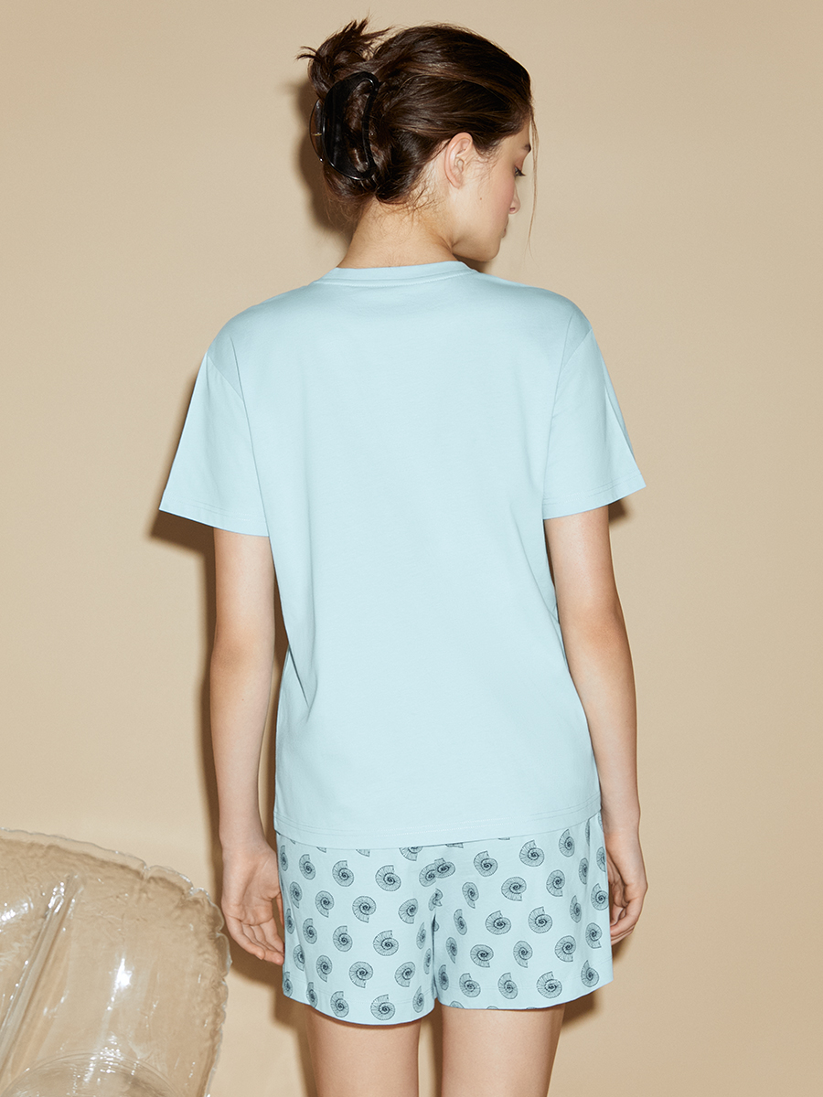 Женская пижама с трендовым принтом: футболка прямого кроя с круглым вырезом и короткими рукавами, а также свободные шорты с удобными карманами и поясом на резинке. Изготовлена из 100% мягкого, гребенного хлопка, который отлично пропускает воздух, приятно ощущается на теле и подходит даже для самой чувствительной кожи. 100% хлопок