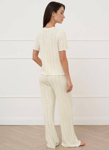Женский домашний комплект из ажурного трикотажа пуантель: полуприлегающая футболка с коротким рукавом и широкие свободные брюки с декоративным гульфиком. Изготовлен из лёгкого и мягкого высококачественного хлопка, который превосходно пропускает воздух, приятно ощущается на теле и подходит даже для нежной и чувствительной кожи. Трикотаж пуантель дарит особый комфорт благодаря эластичности материала и деликатной текстуре. 100% хлопок