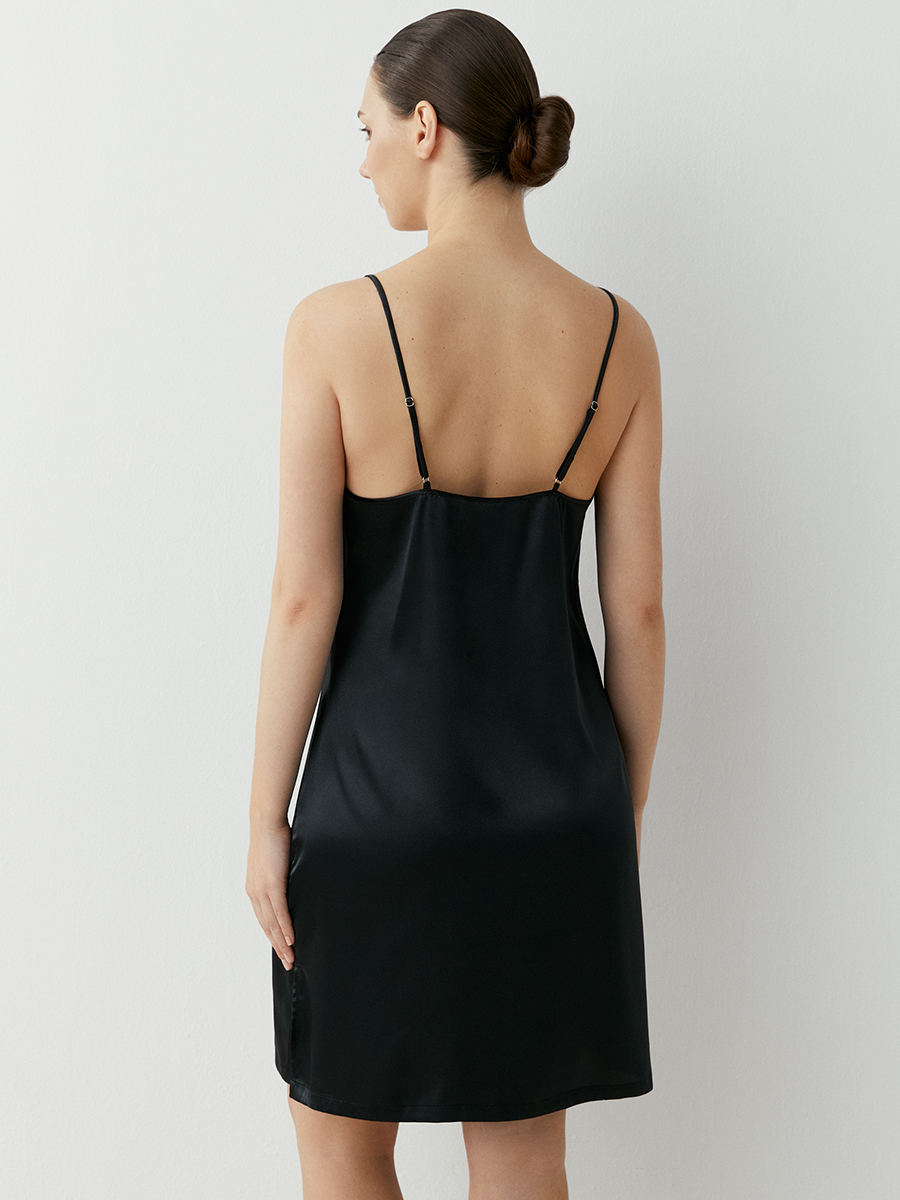 Женская однотонная сорочка прямого силуэта с нагрудными вытачками и диной выше колена. Сорочка с V-образным вырезом, контрастным кантом на тонких регулируемых бретелях и разрезами по бокам,Изготовлена из гладкого и легкого искусственного шелка, который приятно ощущается на теле и хорошо сохраняет форму. Изящная, женственная и очень комфортная сорочка для сна. 95% полиэстер/ 5% эластан