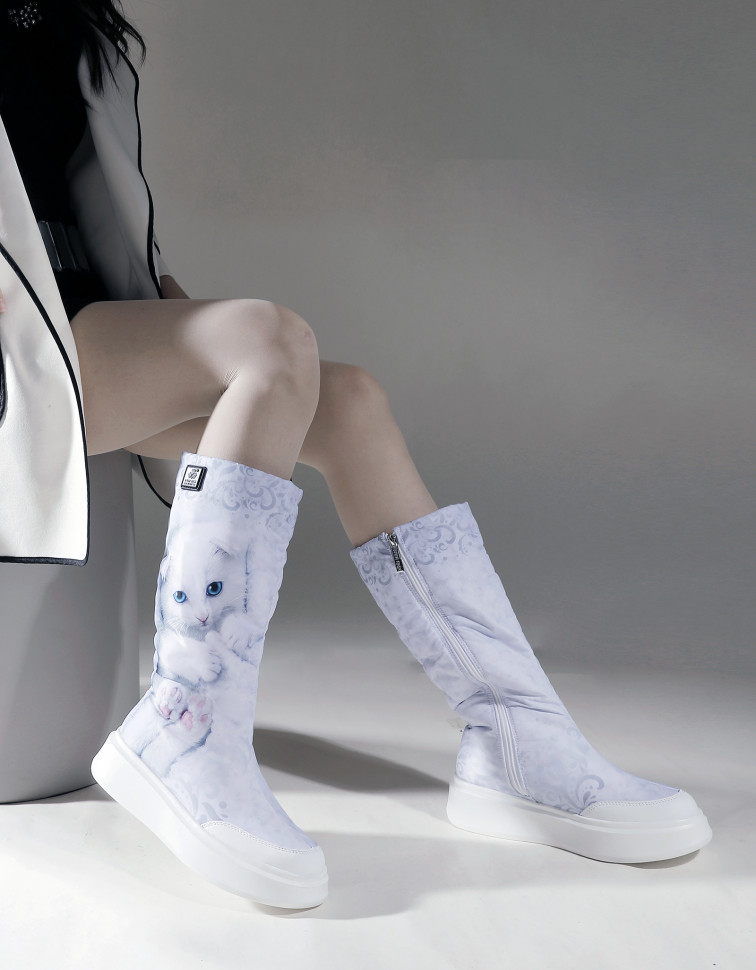 Описание Необычные женские дутики на молнии от KING BOOTS - это модная и невероятно удобная обувь для зимы и морозного демисезона. Непромокаемые и очень теплые, они подходят как для города, так и для активных прогулок на природе. Удобная посадка на ногу и широкий выбор размеров - все это делает наши изделия отличным выбором для любой современной женщины, молодой девушки или девочки - подростка. Водоотталкивающий материал верха - высококачественный нейлон и мембрана KING-TEX, которая не только не пропускает влагу снаружи, но и предотвращает запотевание. Она выводит водяной пар наружу через микроскопические поры. В таких сапожках гарантированы сухость ног, комфортная температура и никакой сырости даже во время прогулок по снегу. За счет мембраны обеспечивается максимально эффективная защита от воды и мороза. Среди особенностей модели можно выделить мысок из натуральной замши, легкую и высокую подошву. Толстая шерстяная подкладка и стелька гарантируют комфорт во время носки. Эти красивые зимние дутики украшены авторским рисунком милым белым котенком. Дутыши с длинным голенищем подойдут на стопу любой полноты: и на узкую, и на широкую. Эта повседневная обувь на легкой платформе подарит комфорт при носке.