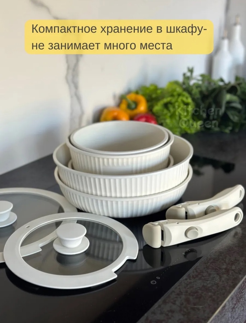 Съемная ручка - 2 штуки, подходят для всех предметов набора. Это делает использование посуды более удобным, особенно при хранении или сервировке.